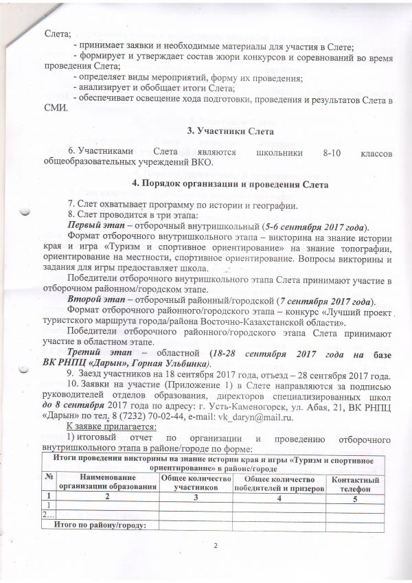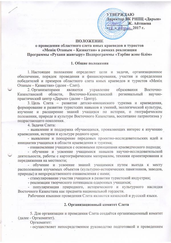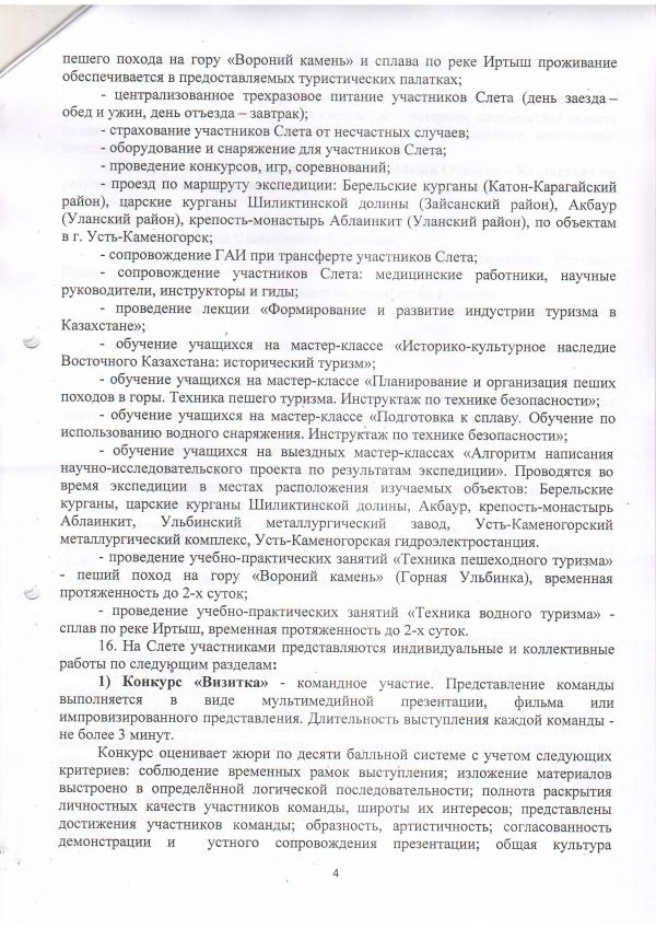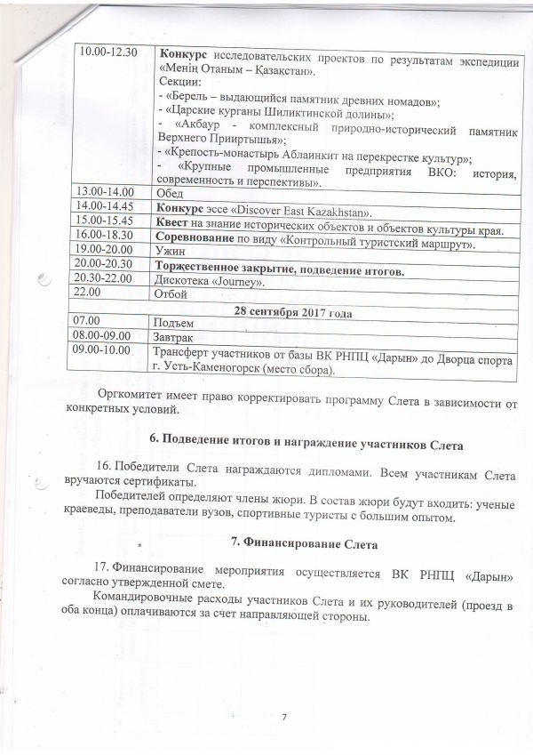19-26 сентября 2017года Экспедиция по исследованию культурно-исторических ценностей, местам трудовой славы ВКО (Берельские курганы, царские курганы Шиликтинской долины, Акбаур, крепость-монастырь Аблаинкит, Ульбинский металлургический завод, Усть-Каменогорский металлургический комплекс, Усть-Каменогорская гидроэлектростанция) в сопровождении научных руководителей, инструкторов и гидов. Выездные мастер-классы «Алгоритм написания научно-исследовательского проекта по результатам экспедиции». Учебно-практические занятия: «Техника пешеходного туризма», «Техника водного туризма». Конкурс «Песня у костра»- 26 сентября 2017 года, 20.00-21.30 часов. |
