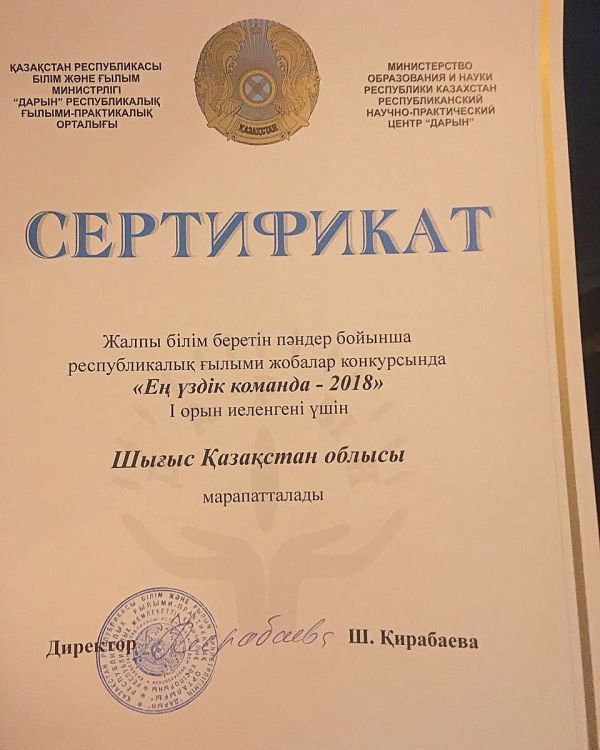 Грамотами Республиканского научно-практического центра «Дарын» Министерства образования и науки Республики Казахстаннаграждены: