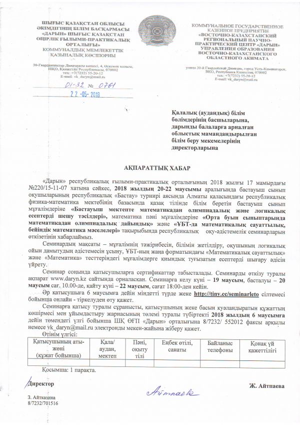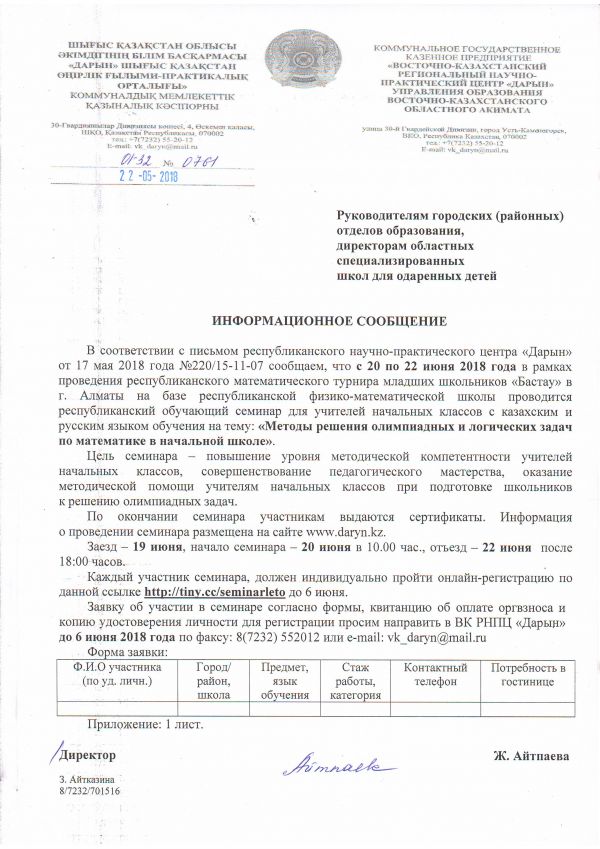В соответствии с письмом республиканского научно-практического центра «Дарын» от 17 мая 2018 года №220/15-11-07 сообщаем, что с 20 по 22 июня 2018 года в рамках проведения республиканского математического турнира младших школьников «Бастау» в г. Алматы на базе республиканской физико-математической школы проводится республиканский обучающий семинар для учителей начальных классов с казахским и русским языком обучения на тему: «Методы решения олимпиадных и логических задач по математике в начальной школе».