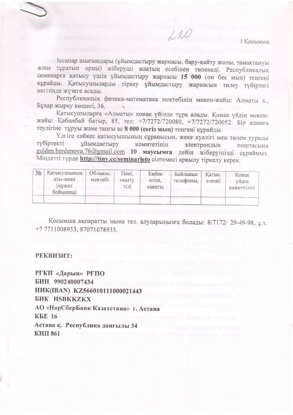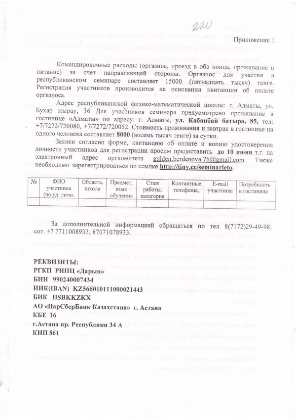 Заявку об участии в семинаре согласно формы, квитанцию об оплате оргвзноса и копию удостоверения личности для регистрации просим направить в ВК РНПЦ «Дарын» до 6 июня 2018 года по факсу: 8(7232) 552012 или e-mail: vk_daryn@mail.ru