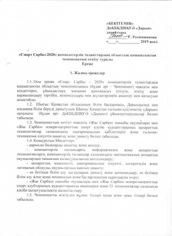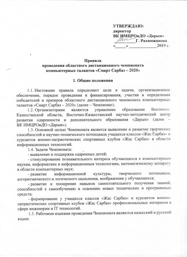 1.1. Настоящие правила определяют цели и задачи, организационное обеспечение, порядок проведения и финансирования, участия и определения победителей и призеров областного дистанционного чемпионата компьютерных талантов «Смарт Сарбаз – 2020»(далее – Чемпионат).