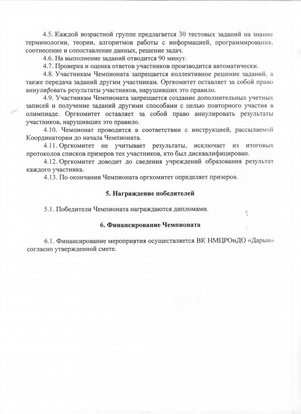 4.5. Каждой возрастной группе предлагается 30тестовых заданий на знание терминологии, теории, алгоритмов работы с информацией, программирования, соотнесение и сопоставление данных, решение задач.