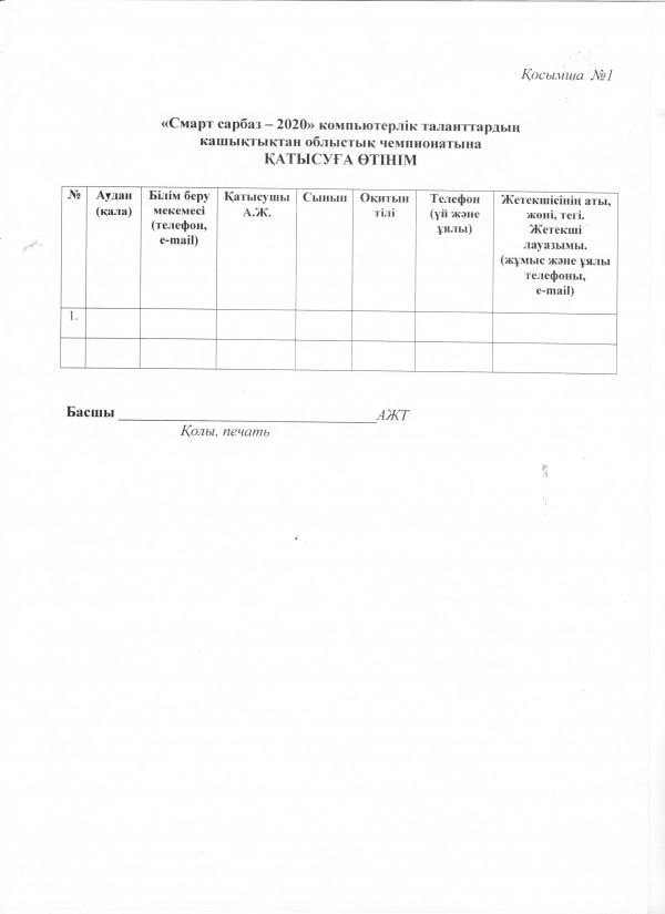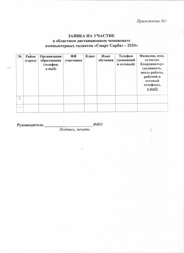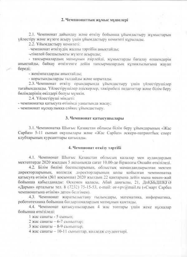 4.2. Заявки на участие в Чемпионате (Приложение №1) за подписью руководителей отделов образования, директоров областных специализированных школ, директоров колледжей(в электронном и отсканированном вариантах!) принимаются до 22 января 2020 года по адресу: г. Усть-Каменогорск, ул. Абая, 21, ВК НМЦРОиДО «Дарын» по тел. 8 (7232) 75-15-53, е-mail: or-vpv@mail.ru