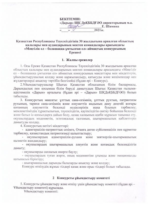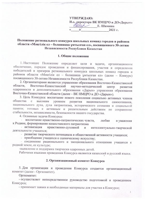 9. Конкурсқа қатысу (1-қосымша) туралы білім беру ұйымдарының басшылары, мамандандырылған мектеп директорларының қолымен бекітілген сұраныс 2021 жылғы 16 қарашаға дейін келесі мекен-жайға жіберіледі:Өскемен қ. Абай даңғылы 21, «Дарын» ШҚ ДпҚББДҒӘО, тел. 8 (7232) 70-02-44, е-mail: vk_daryn@mail.ru