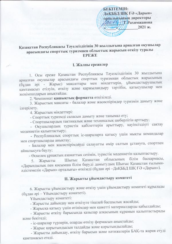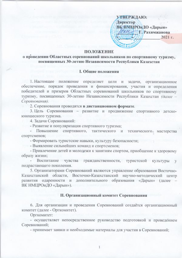 1. Настоящее положение определяет цели и задачи, организационное обеспечение, порядок проведения и финансирования, участия и определения победителей и призеров Областных соревнований школьников по спортивному туризму, посвященных 30-летию Независимости Республики Казахстан (далее – Соревнования).