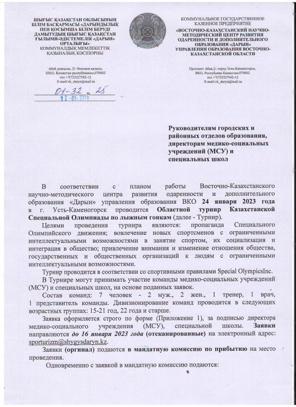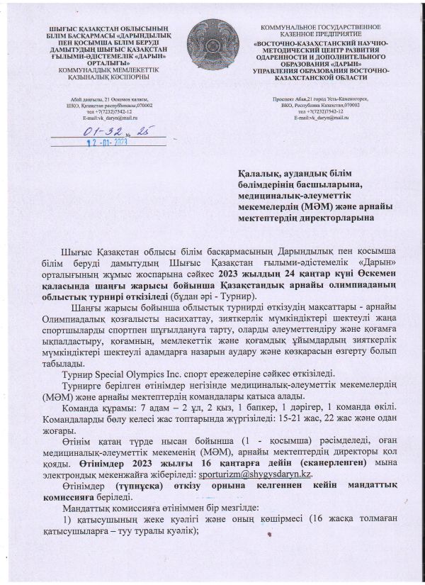 В соответствии с планом работы Восточно-Казахстанского научно-методического центра развития одаренности и дополнительного образования «Дарын» управления образования ВКО 24 января 2023 года в г. Усть-Каменогорск проводится Областной турнир Казахстанской Специальной Олимпиады по лыжным гонкам (далее - Турнир).