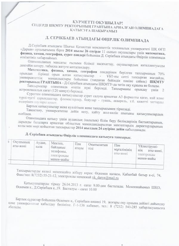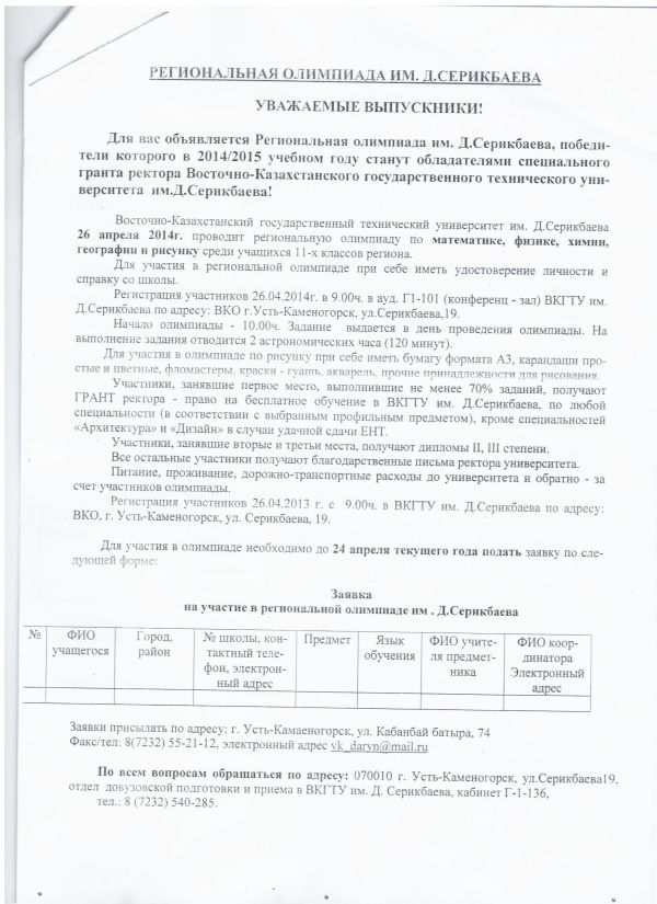 ВК РНПЦ «Дарын» совместно с Восточно-Казахстанским государственным техническим университетом им. Д. Серикбаева 12 апреля 2014 года для учащихся 11-х классов проводит региональную олимпиаду им. Д. Серикбаева по предметам математика, физика, химия, география и рисунок.