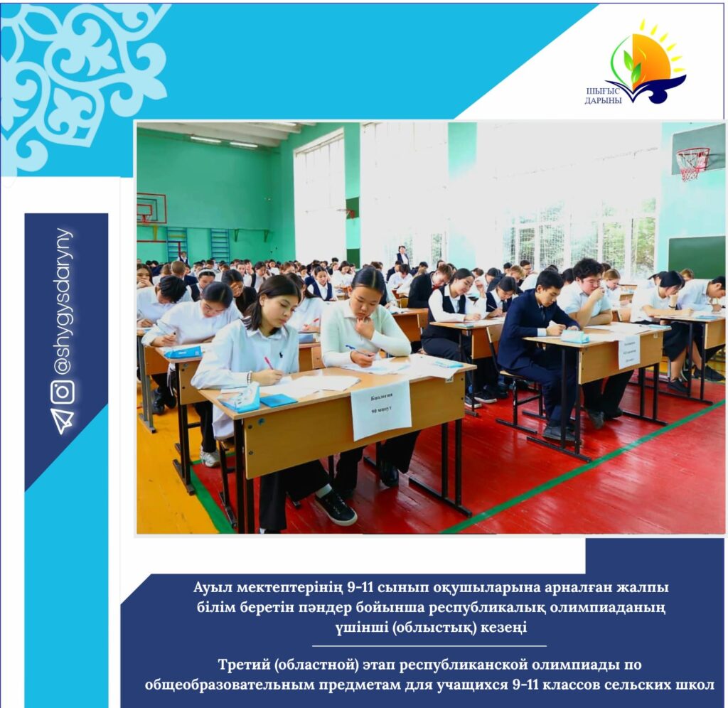 Ауыл мектептерінің 9-11 сынып оқушыларына арналған жалпы білім беретін пәндер бойынша республикалық олимпиаданың үшінші (облыстық) кезеңі 2025 жылдың 28-30 қазаны аралығында өтуде. Олимпиадаға 9-11 сыныптардан 640 оқушы қатысуда.